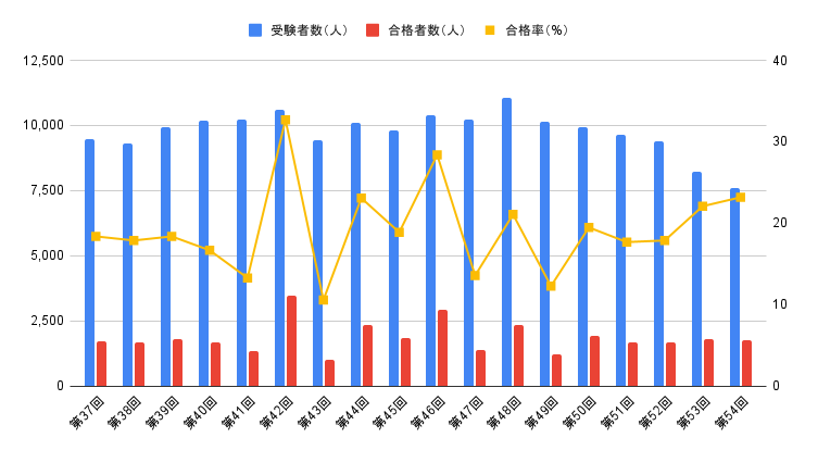第37回(平成19年度)~第54回(令和6年度)の建築物環境衛生管理技術者の合格率・受験者数・合格者数、合格率の推移(2軸グラフ)をまとめました。