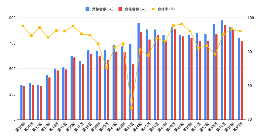 第30回~第55回の視能訓練士国家試験の合格率・受験者数・合格者数、合格者数の推移(2軸グラフ)をまとめました。